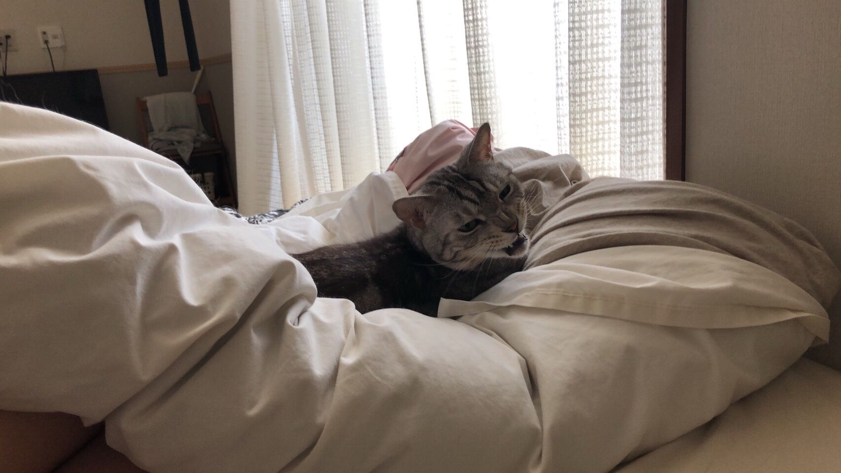猫と一緒の布団で寝ると人間が端に追いやられる Day129 2 27 むぎにゃん